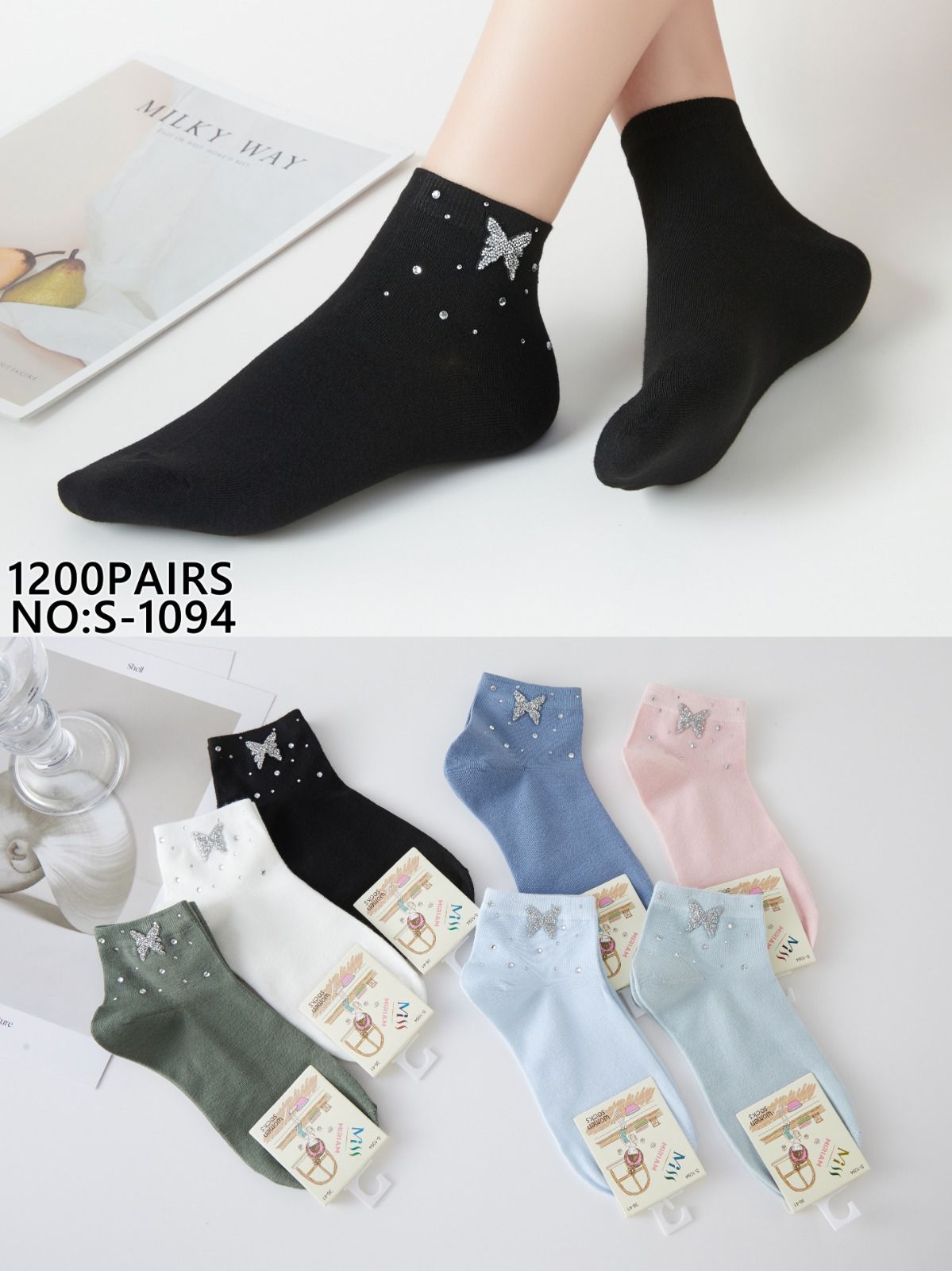 Calcetines de tobillo con diseño de mariposa y pedrería-S-1094