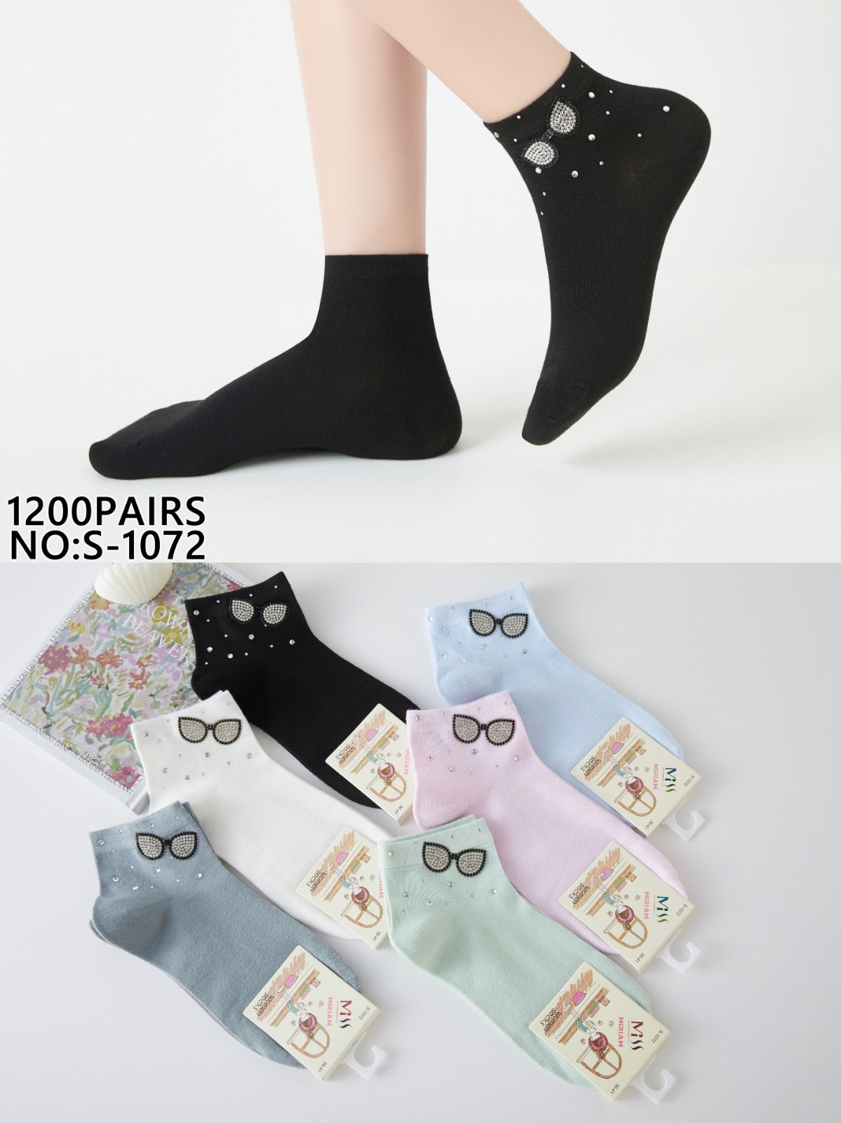 Calcetines tobilleros de mujer con aplique de pedrería-S-1072