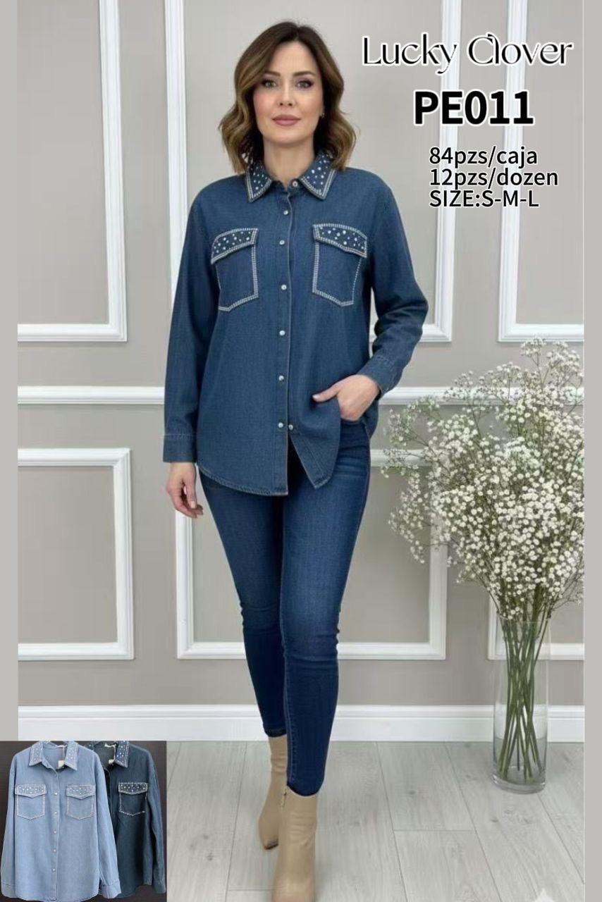 Camisa de mezclilla con cuello y bolsillos decorados-PE011