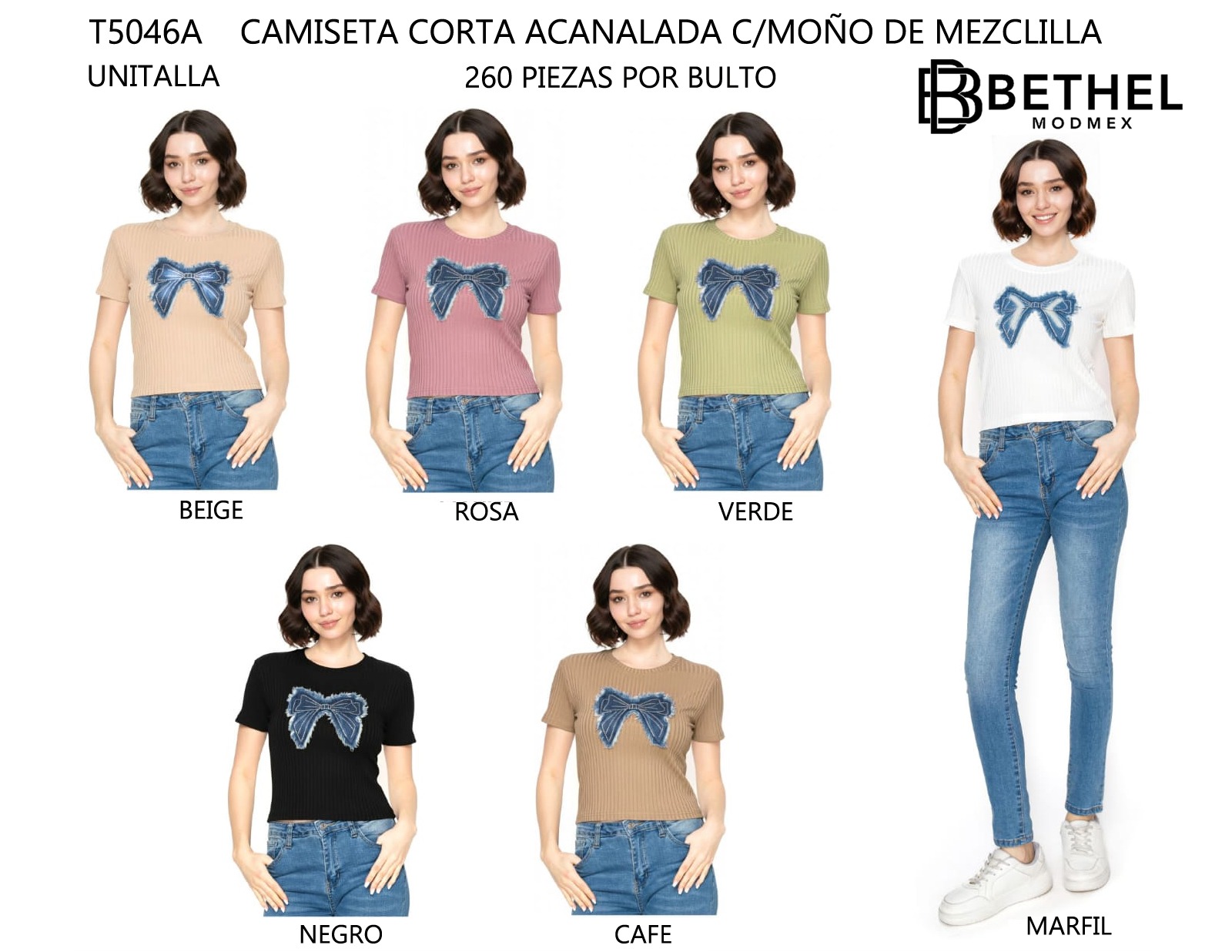 Camiseta acanalada corta con moño de mezclilla-T5046A