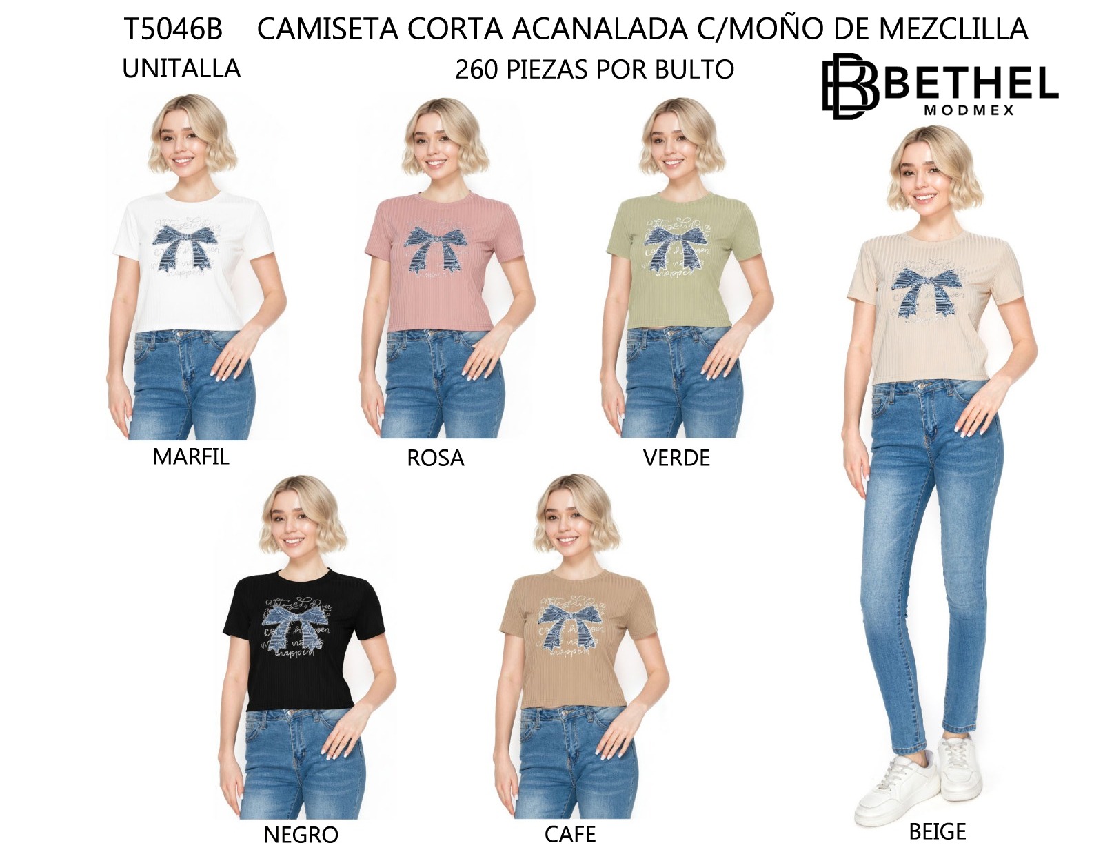 Camiseta corta acanalada con moño de mezclilla-T5046B
