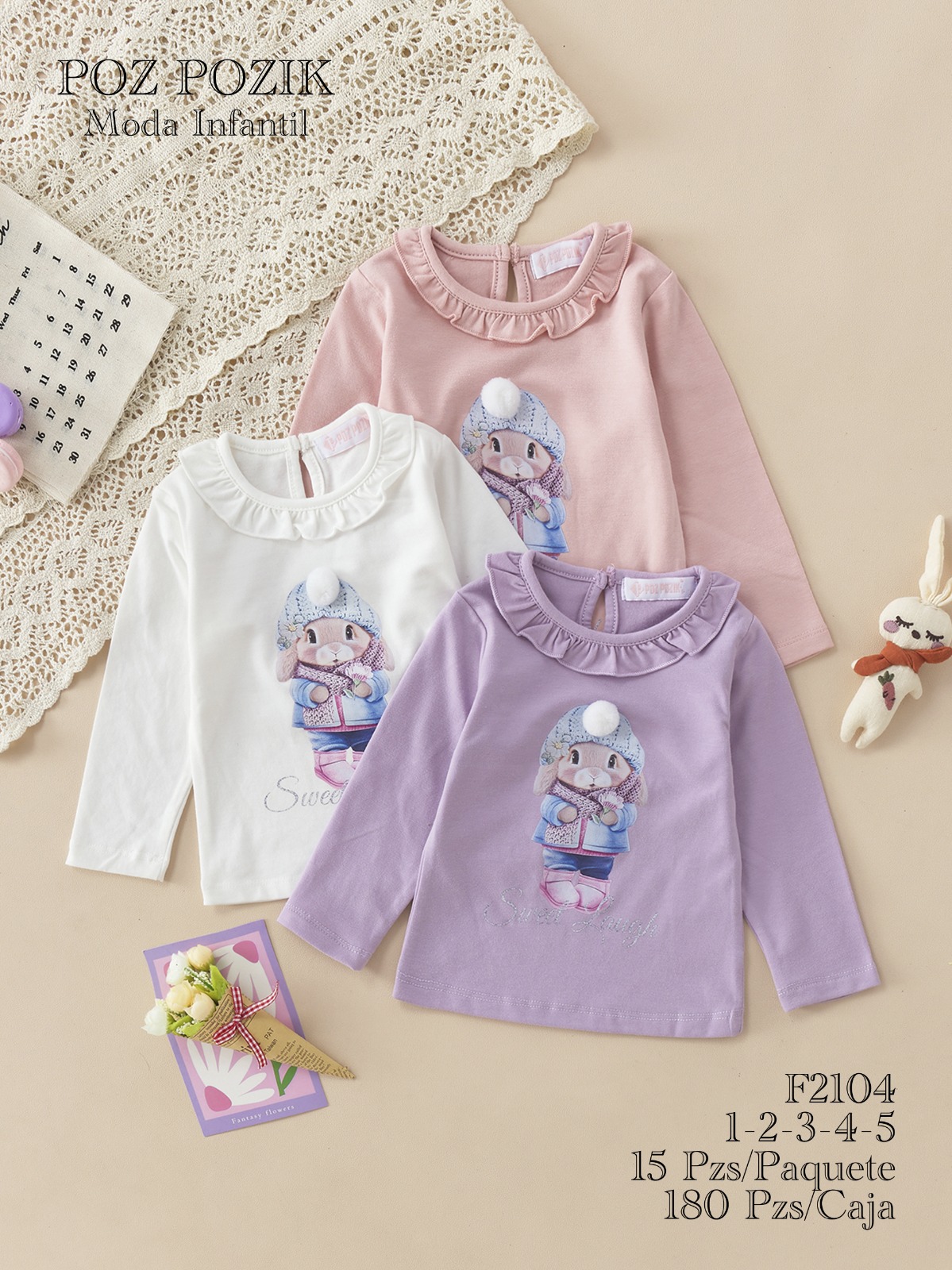 Camisetas de manga larga con estampado de conejo para niña-F2104