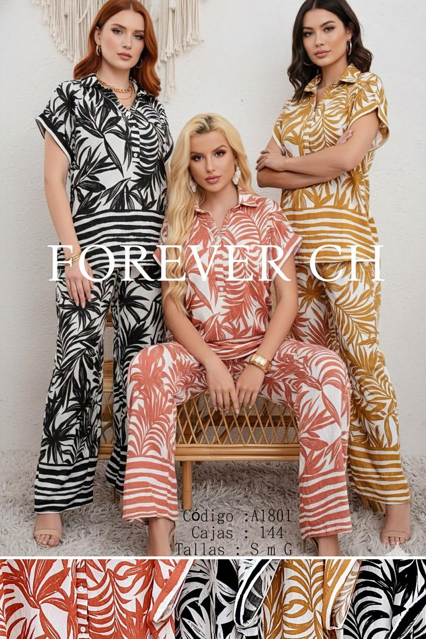 Conjunto de camisa y pantalón con estampado de hojas-A1801