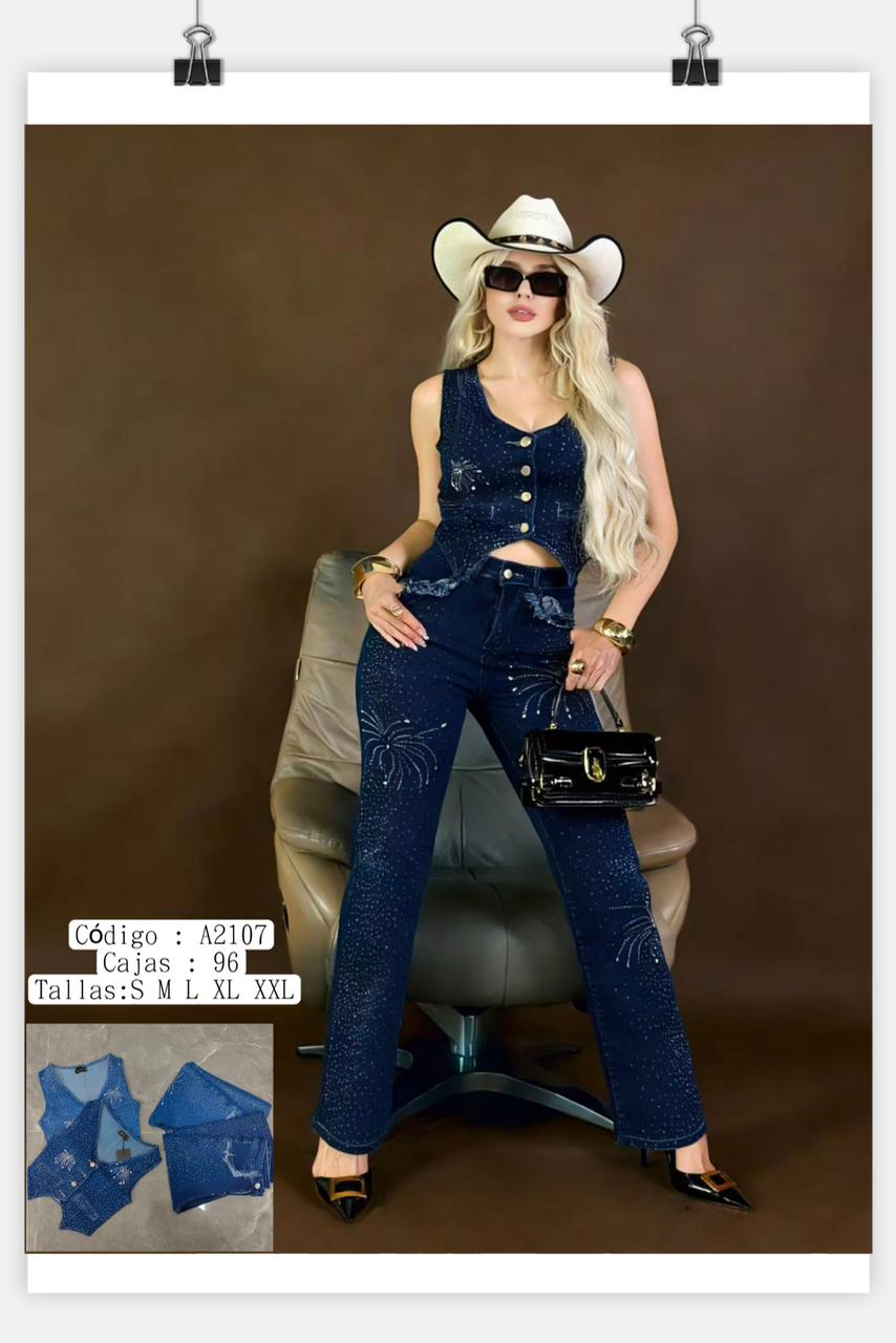 Conjunto de chaleco y pantalón de mezclilla con brillos-A2107