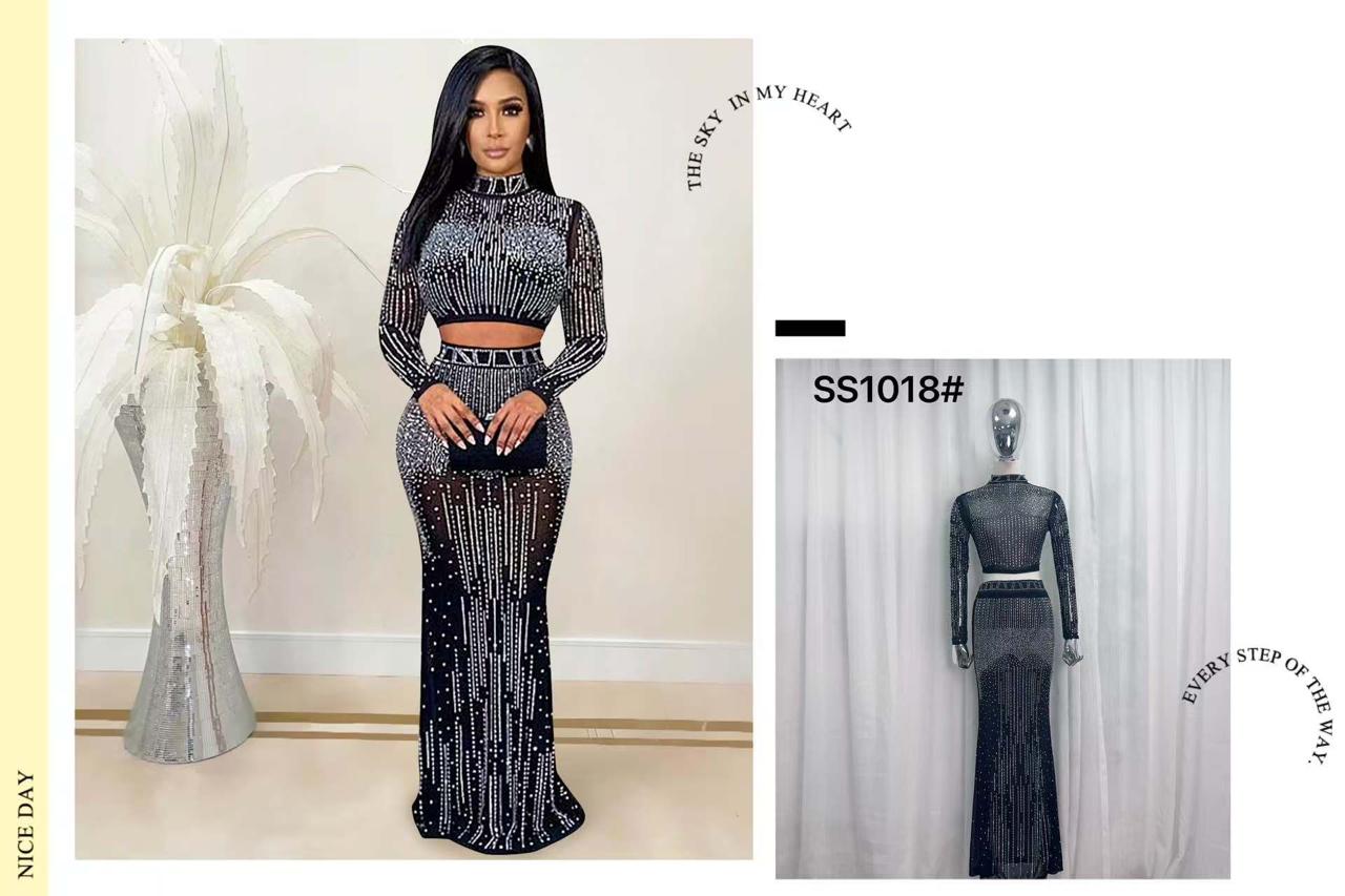 Conjunto de crop top y falda larga con pedrería-SS1018