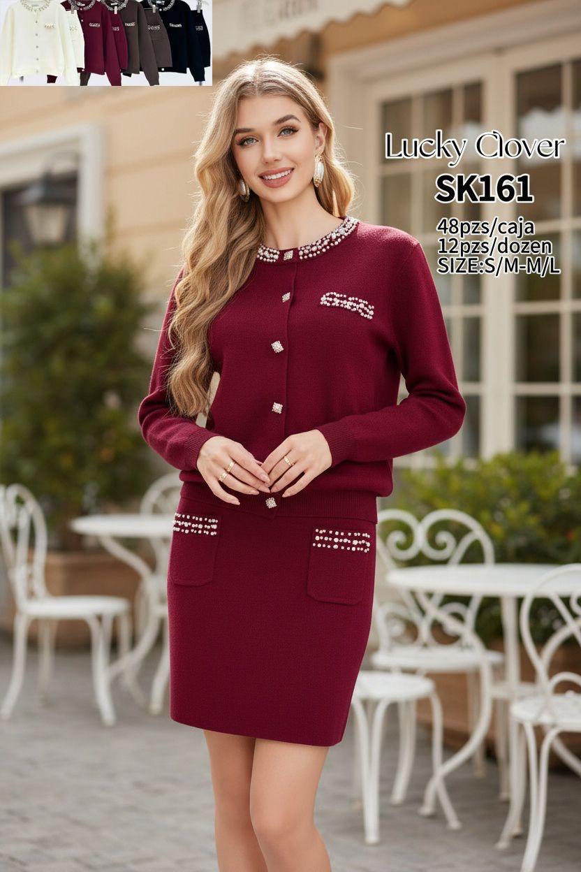 Conjunto de falda y cárdigan con detalles de perlas-SK161