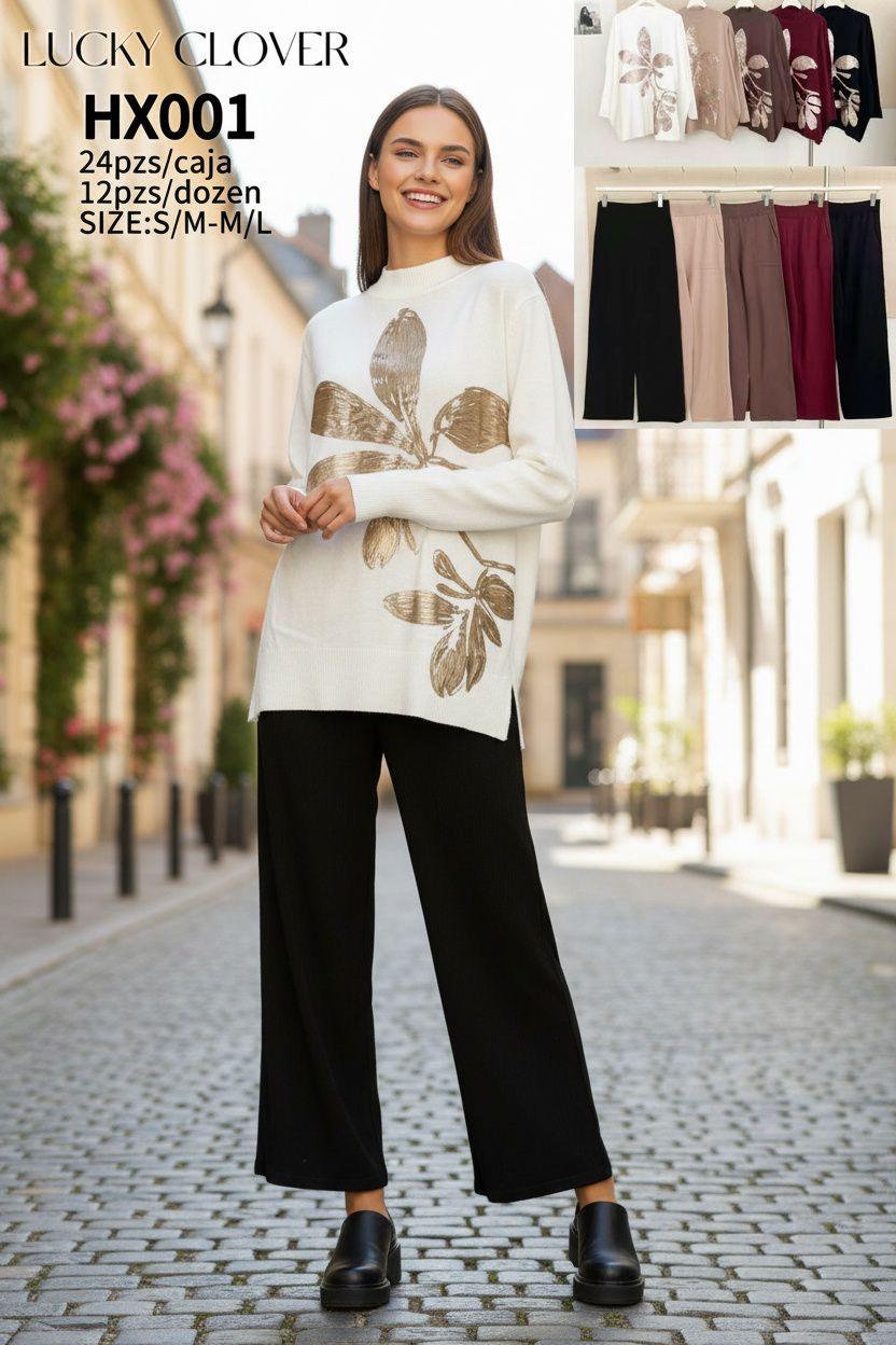 Conjunto de pantalón y suéter con estampado floral-HX001
