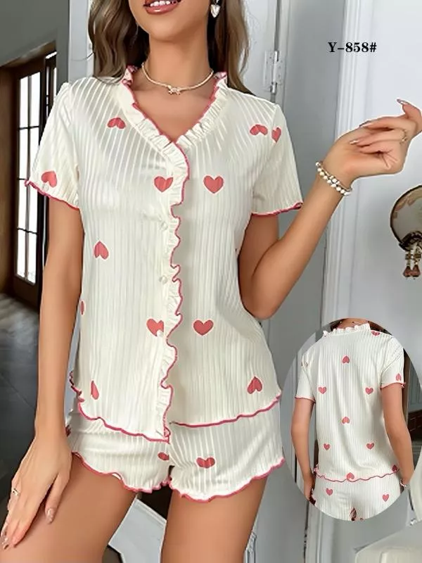 Conjunto de pijama de camisa y shorts con estampado de corazones-Y-858#