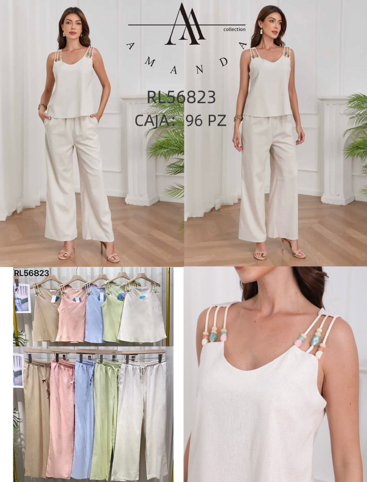 Conjunto de top sin mangas con detalles y pantalón amplio-RL56823