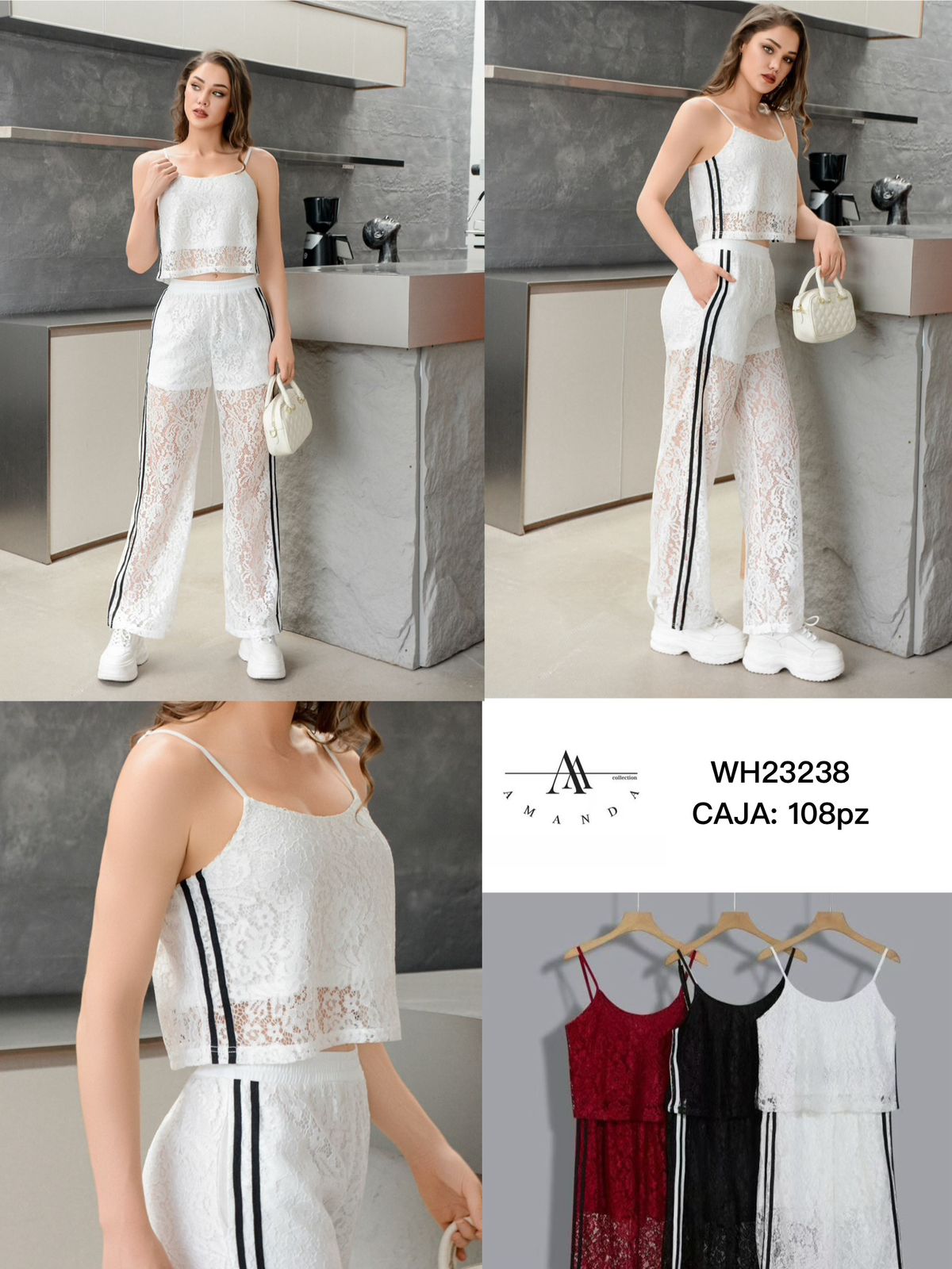 Conjunto de Top y Pantalón de Encaje con Rayas-WH23238
