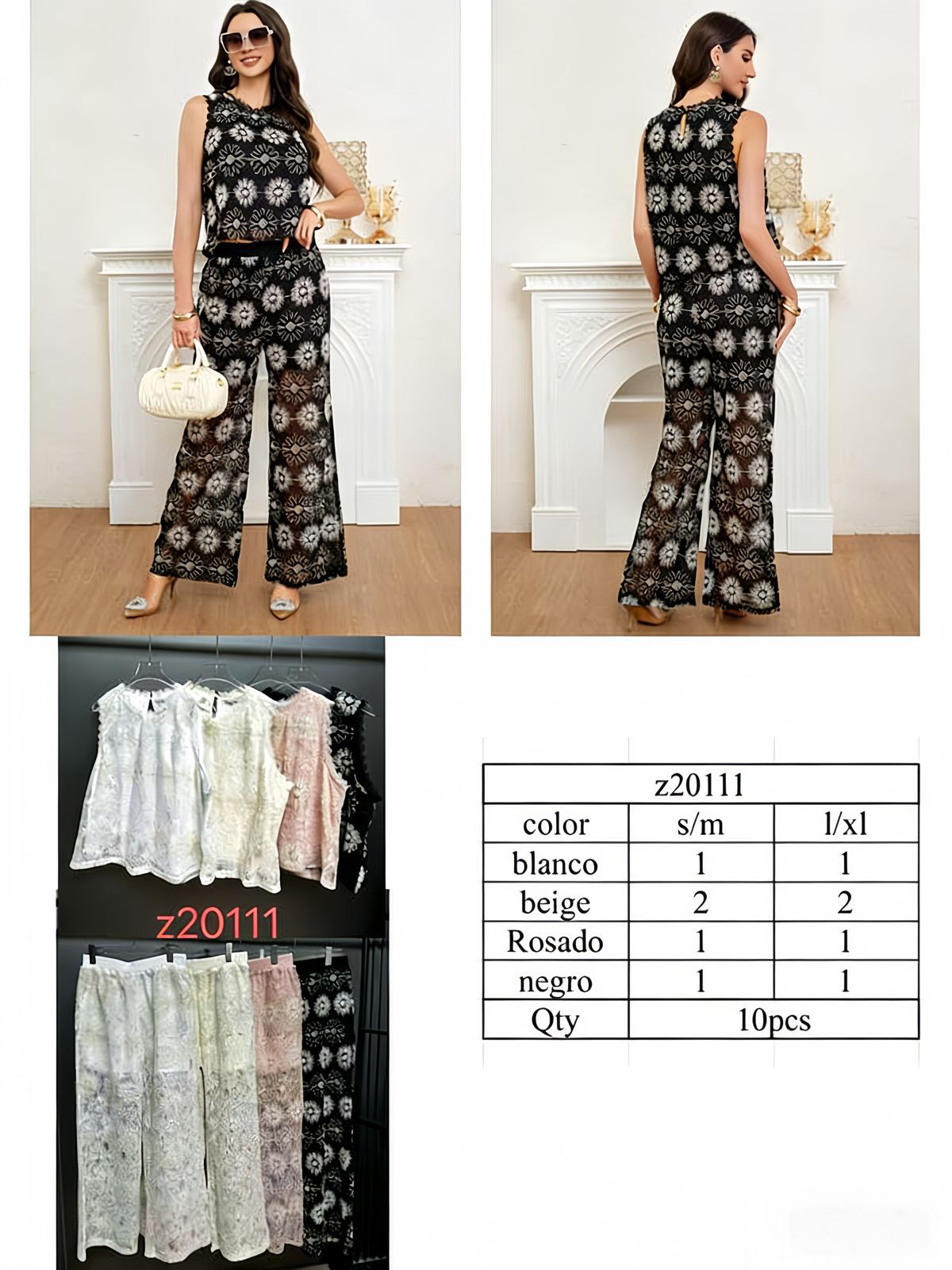 Conjunto de Top y Pantalón Largo de Encaje Floral-Z20111