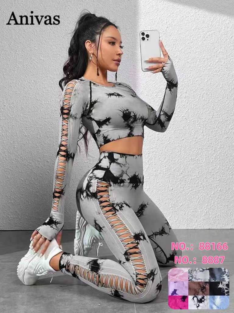 Conjunto deportivo de top crop de manga larga y leggings con detalles de cordones-88166