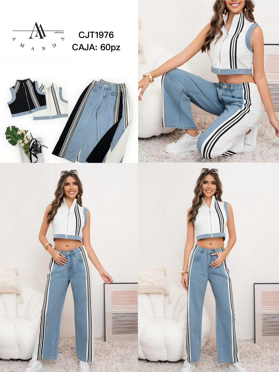 Conjunto top con cremallera y pantalón de rayas-CJT1976