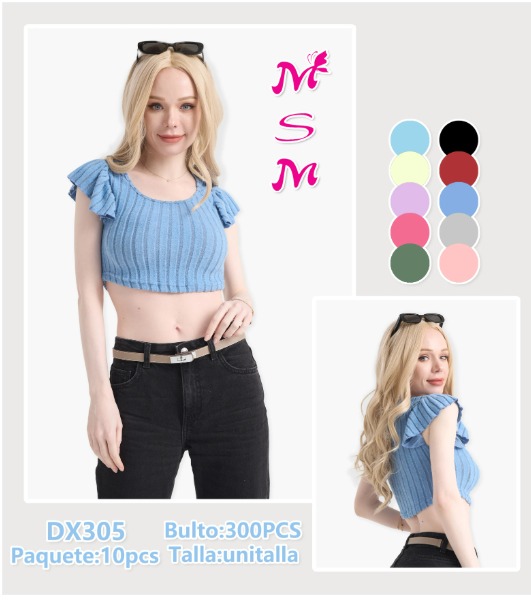 Crop Top de tejido acanalado con mangas con volantes-DX305