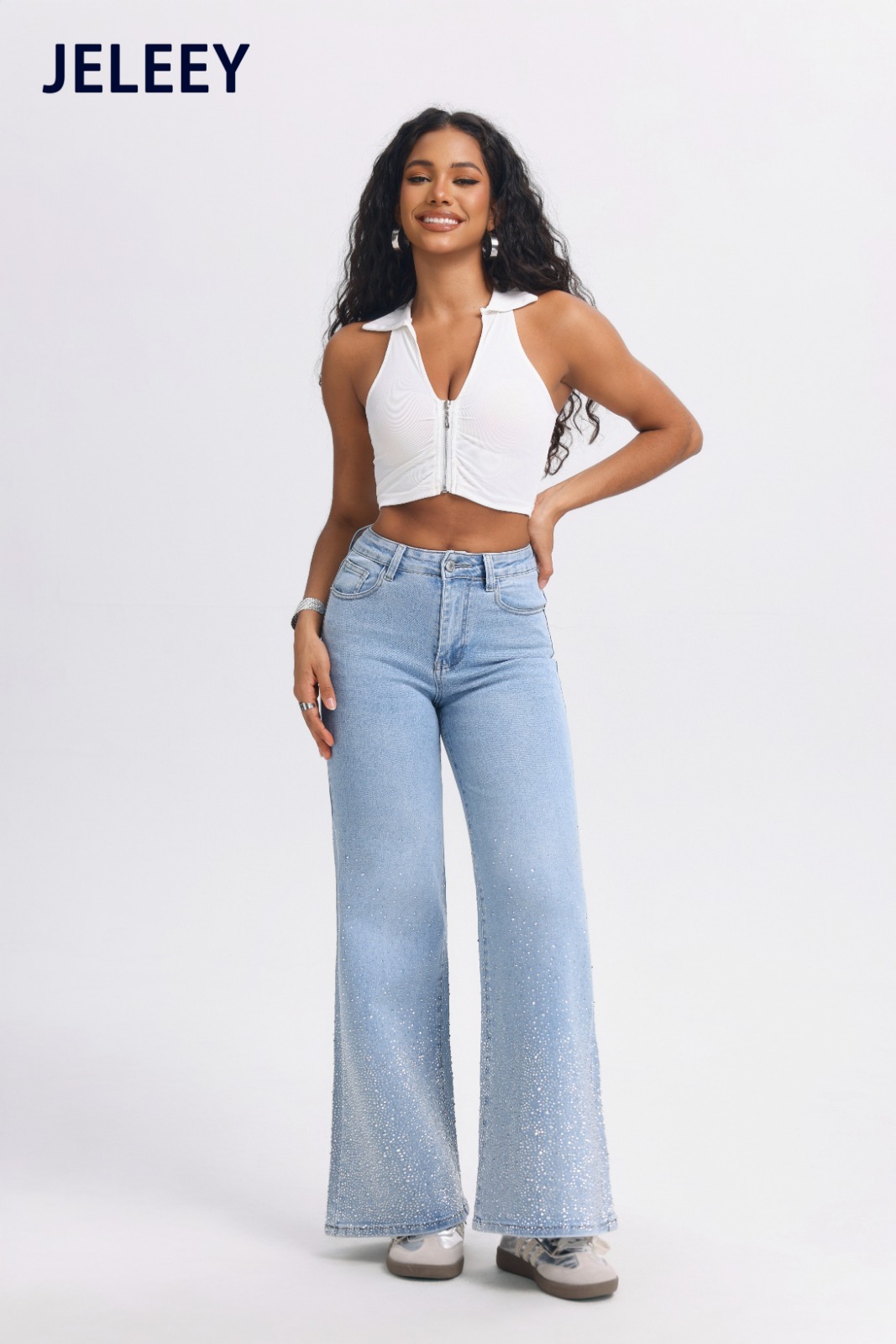 Jeans de corte acampanado con detalles brillantes-D9055