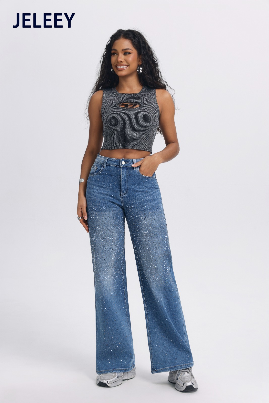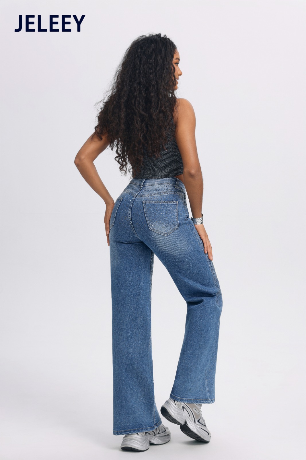 Jeans de corte acampanado con detalles brillantes para mujer-D9050
