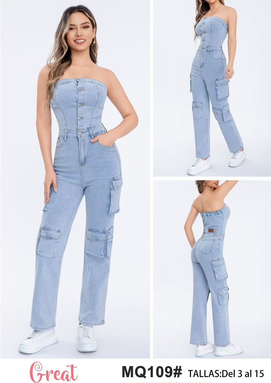 Mono de mezclilla con bolsillos cargo-MQ109