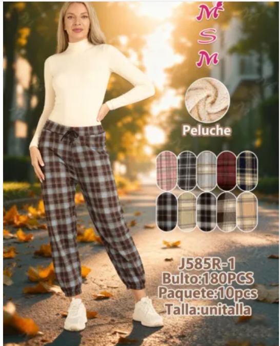 Pantalón de felpa con estampado de cuadros para mujer-J585R-1
