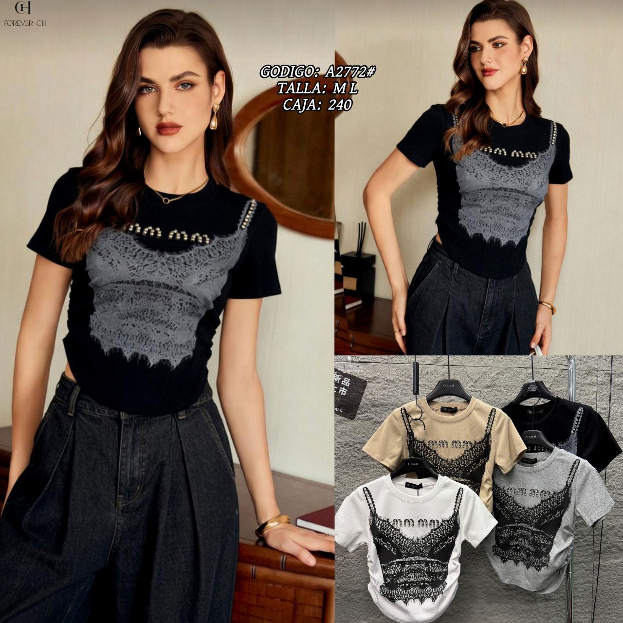Playera de manga corta con diseño de corsé de encaje-A2772