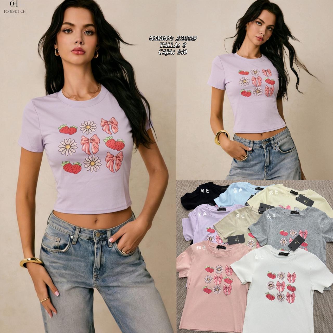 Playera de manga corta con estampado de fresas y margaritas-A2652
