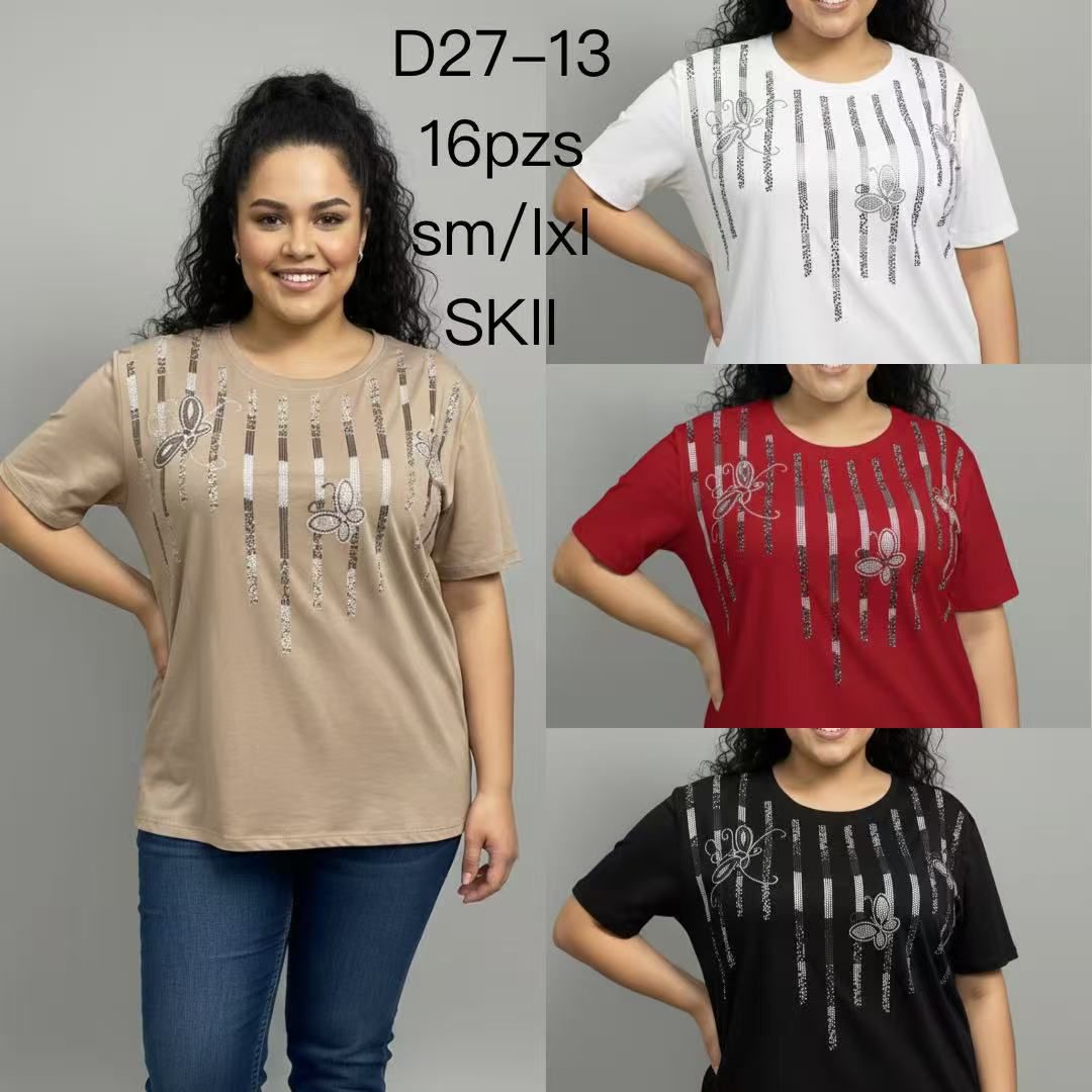 Playera de mujer con estampado brillante de mariposas y rayas-D27-13