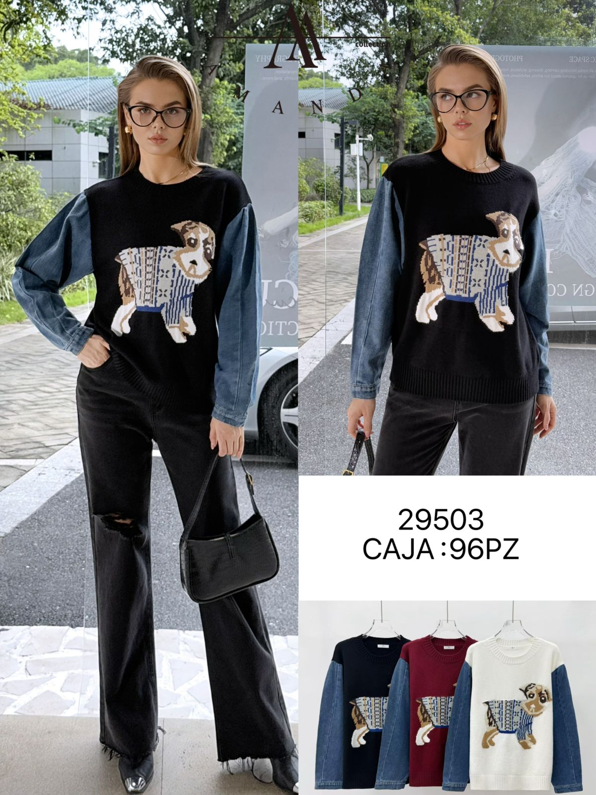 Suéter con diseño de perro y mangas de mezclilla para mujer-29503