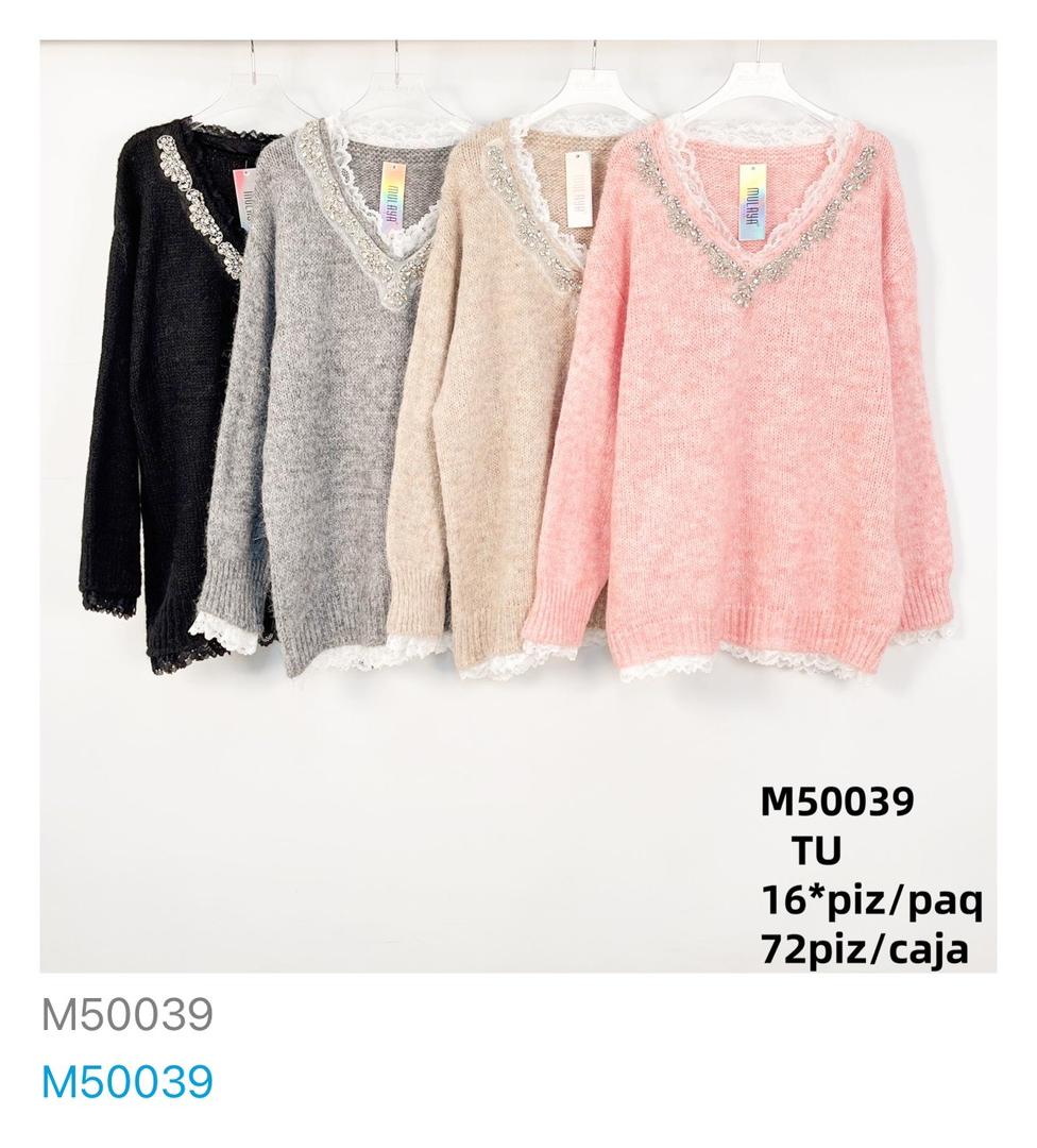 Suéter V con Encaje y Pedrería-M50039