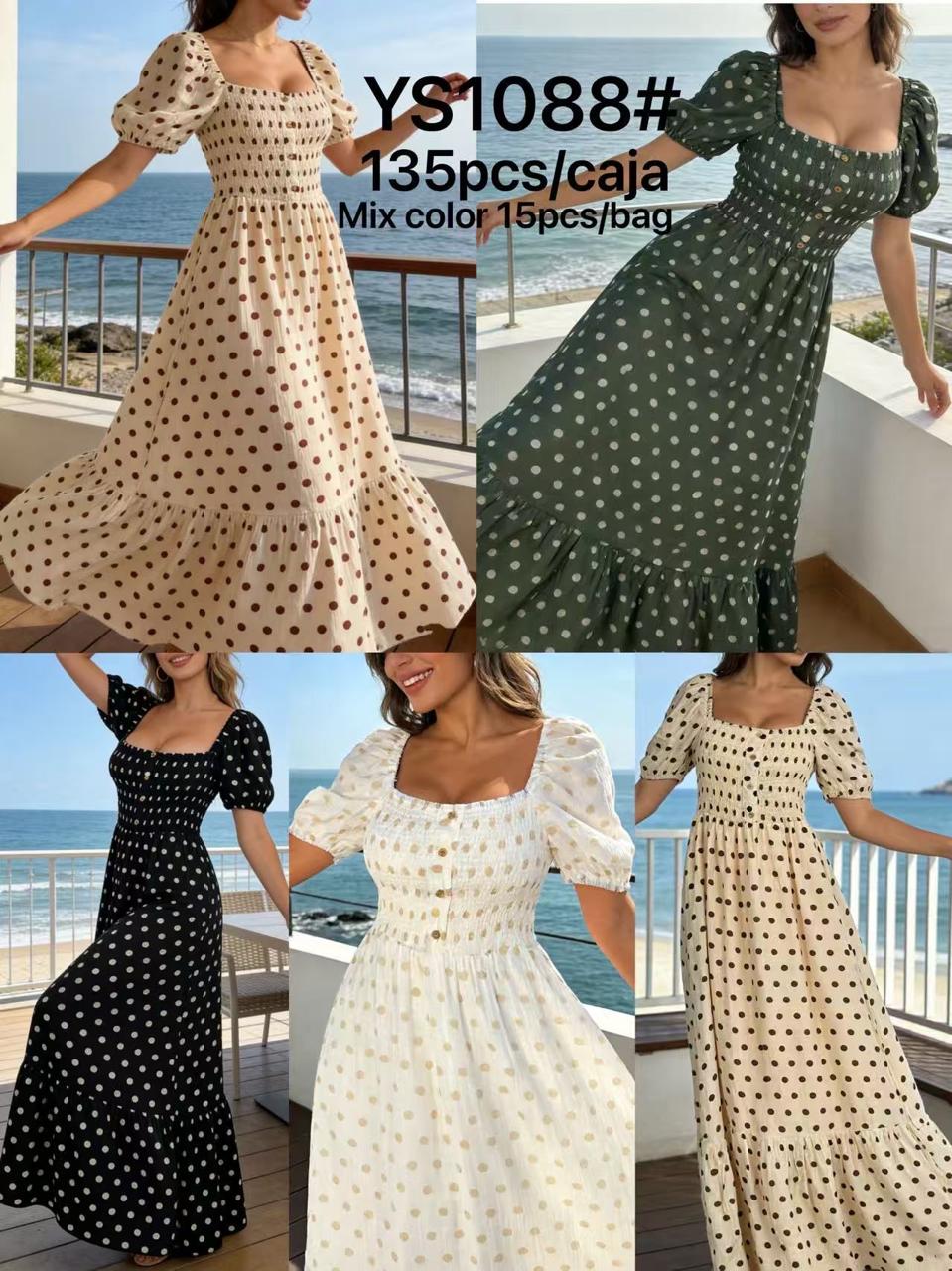 Vestido largo de lunares con manga puffy y escote cuadrado-YS1088