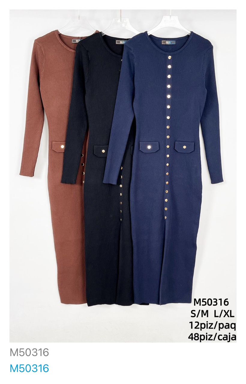 Vestido midi acanalado con botones-M50316